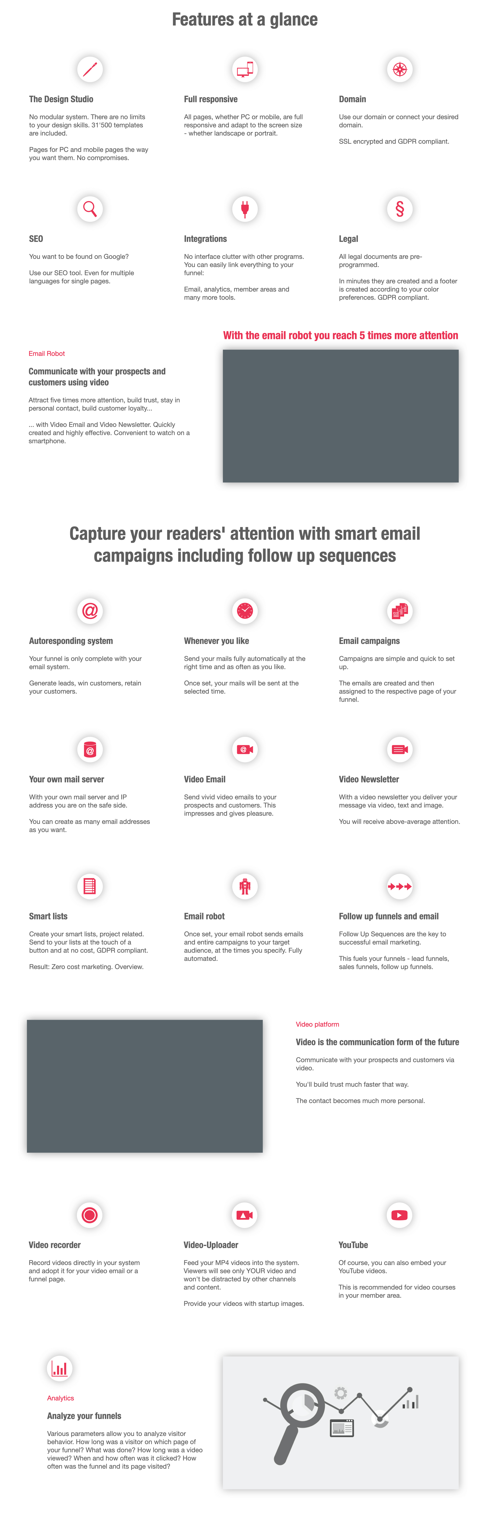 A sales process is presented with a page sequence. Automatic emails - also video emails for more attention - complete the system for more customers and sales.